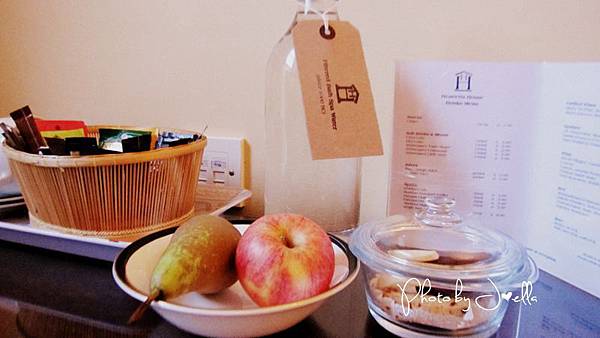 滿滿一小籃茶包咖啡包與巧克力,玻璃盆裝新鮮手作餅乾,還有迎賓水果與礦泉水。